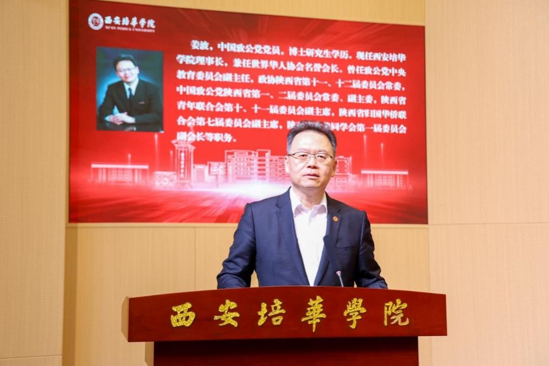 西安培华学院理事长姜波致辞。他深情回顾了学院发展历程,特别是产教融合的探索之路。他指出,当前学校发展迎来前所未有的机遇——已与三百余家企业开展深度合作,国际院士科技创新中心西安中心亦落户培华。他强调,姜维之老先生生前曾明确:办教育须坚守立德树人根本任务,并为人口老龄化加剧的中国培养复合型应用人才。他特别指出校企合作对药学专业发展的关键作用,期待与企业深化合作,共谱发展新篇章。