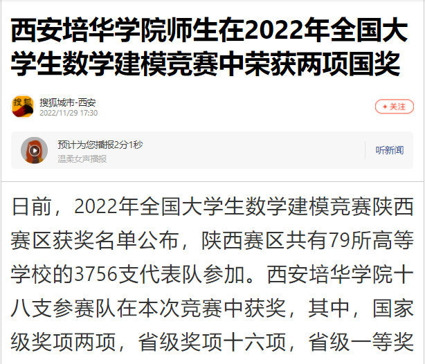 日前,2022年全国大学生数学建模竞赛陕西赛区获奖名单公布,陕西赛区共有79所高等学校的3756支代表队参加。西安培华学院十八支参赛队在本次竞赛中获奖,其中,国家级奖项两项,省级奖项十六项,省级一等奖五项,省级二等奖十一项。路陈红老师指导学生武煜坤、焦豪和崔康康参赛队参赛作品被评为全国一等奖,陈文利老师指导学生武永永、王可力和刘儒海参赛作品被评为全国二等奖,学校获陕西赛区优秀组织工作奖,在该赛中连续两年获得国家一等奖奖项。