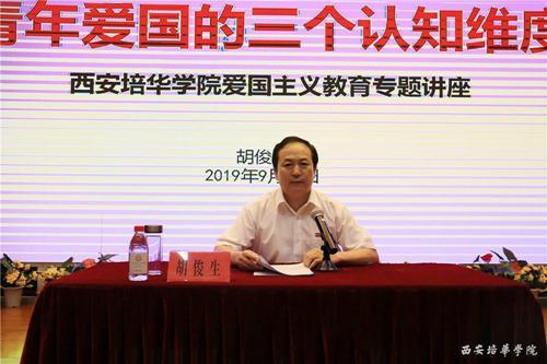 9月27日下午,西安培华学院党委书记胡俊生在维之图书馆报告厅为2019级新生进行爱国主义教育专题讲座,胡俊生书记从爱国认知的理性维度、情感维度和角色维度三个部分详细分析“青年爱国的三个认知维度”。