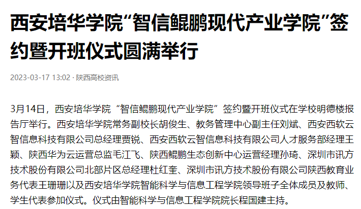 3月14日,西安培华学院“智信鲲鹏现代产业学院”签约暨开班仪式在学校明德楼报告厅举行。西安培华学院常务副校长胡俊生、教务管理中心副主任刘斌、西安西软云智信息科技有限公司总经理贾锐、西安西软云智信息科技有限公司人才服务部经理王颖、陕西华为云运营总监毛江飞、陕西鲲鹏生态创新中心运营经理孙琦、深圳市讯方技术股份有限公司北部片区总经理杜红奎、深圳市讯方技术股份有限公司陕西教育业务代表王珊珊以及西安培华学院智能科学与信息工程学院领导班子全体成员及教师、学生代表参加仪式。仪式由智能科学与信息工程学院院长程国建主持。