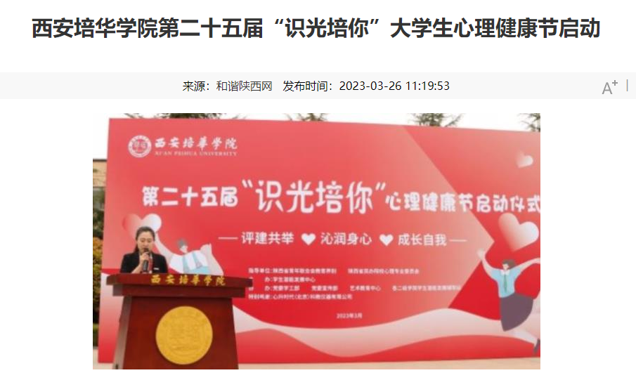 西安培华学院监事会主席、工会主席徐国富呼吁广大青年在各类实践中塑造阳光心灵,表示学校将不断挖掘育人资源,不断搭建育人平台,不断创新育人形式,全方位加强学校大学生心理健康教育工作。最后,徐国富宣布西安培华学院第二十五届“识光培你”大学生心理健康节正式启动。