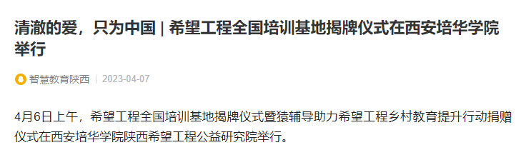 此次挂牌的希望工程全国培训基地坐落于西安培华学院陕西希望工程公益研究院。2020年11月20日,为深入学习贯彻落实习近平总书记对希望工程寄语精神,推动新时代陕西希望工程事业发展,团省委、省青基会联合西安培华学院成立了西安培华学院陕西希望工程公益研究院,通过公益研究院的组织和平台建设,促进陕西希望工程在聚焦定位、战略转型、提档升级和制度治理等方面实现质的飞跃。挂牌希望工程全国培训基地后,这里将成为希望工程助力青少年公益事业健康发展的助推器、凝聚爱心力量服务青少年成长发展的桥头堡、宣传弘扬新时代希望工程精神内涵的大平台。