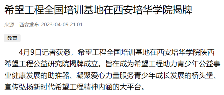 4月9日记者获悉,希望工程全国培训基地在西安培华学院陕西希望工程公益研究院揭牌成立。旨在成为希望工程助力青少年公益事业健康发展的助推器、凝聚爱心力量服务青少年成长发展的桥头堡、宣传弘扬新时代希望工程精神内涵的大平台。