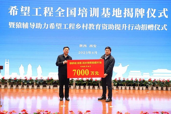 中国青少年发展基金会党委书记、理事长郭美荐代表中国青少年发展基金会向陕西希望工程赠送价值7000万元的教育提升配套物资,共青团陕西省委书记、省青联主席徐永胜代表陕西希望工程接受捐赠。