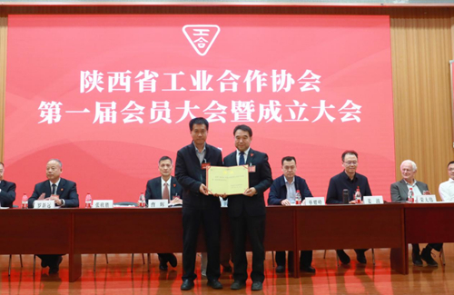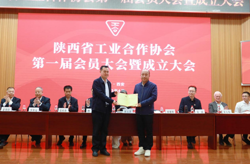 与会领导为新当选的理事长、监事长、副理事长以及秘书长颁发聘书。田玉萍、单耀峰、张欣胜、姜波等同志共同为陕西省工业合作协会揭牌。西安纺织控股有限责任公司纪委书记杨柳宣读了陕西省人大常委会原副主任、省政府原副省长李金柱同志向大会发来的贺信。