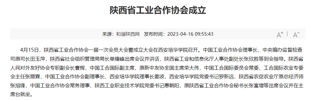 4月15日,陕西省工业合作协会一届一次会员大会暨成立大会在西安培华学院召开。中国工业合作协会理事长、中央编办监督检查司原司长田玉萍,陕西省社会组织管理局局长单耀峰出席会议并讲话,陕西省工业和信息化厅人事处副处长张欣胜等到会指导。陕西省人民对外友好协会专职副会长曹辉,中国工合国际副主席、原新中友协全国主席荣大伟,中国工合国际委员会常委、工合国际农业专委会主任张羱霖,中国工业合作协会副理事长、西安培华学院理事长姜波,西安培华学院党委书记罗新远,陕西省农促农业厅原总经济师张旭锋,中国工业合作协会常务理事、陕西工业职业技术学院党委书记惠朝阳,原陕西省工业合作协会秘书长张富增等出席会议并在主席台就坐。