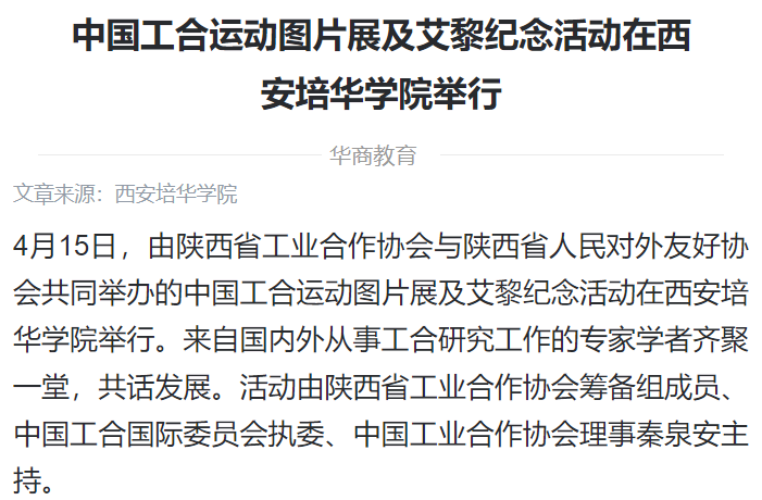 4月15日,由陕西省工业合作协会与陕西省人民对外友好协会共同举办的中国工合运动图片展及艾黎纪念活动在西安培华学院举行。来自国内外从事工合研究工作的专家学者齐聚一堂,共话发展。活动由陕西省工业合作协会筹备组成员、中国工合国际委员会执委、中国工业合作协会理事秦泉安主持。