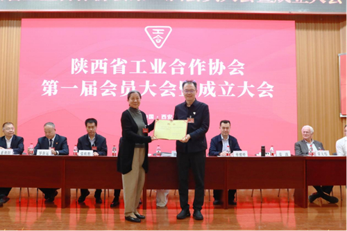 与会领导为新当选的理事长、监事长、副理事长以及秘书长颁发聘书。田玉萍、单耀峰、张欣胜、姜波等同志共同为陕西省工业合作协会揭牌。西安纺织控股有限责任公司纪委书记杨柳宣读了陕西省人大常委会原副主任、省政府原副省长李金柱同志向大会发来的贺信。