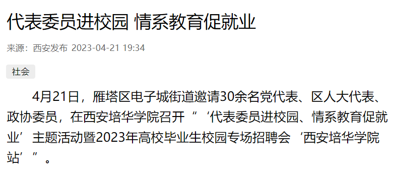 4月21日,雁塔区电子城街道邀请30余名党代表、区人大代表、政协委员,在西安培华学院召开“‘代表委员进校园、情系教育促就业’主题活动暨2023年高校毕业生校园专场招聘会‘西安培华学院站’”。