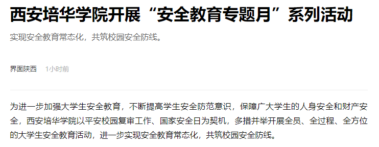 为进一步加强大学生安全教育,不断提高学生安全防范意识,保障广大学生的人身安全和财产安全,西安培华学院以平安校园复审工作、国家安全日为契机,多措并举开展全员、全过程、全方位的大学生安全教育活动,进一步实现安全教育常态化,共筑校园安全防线。