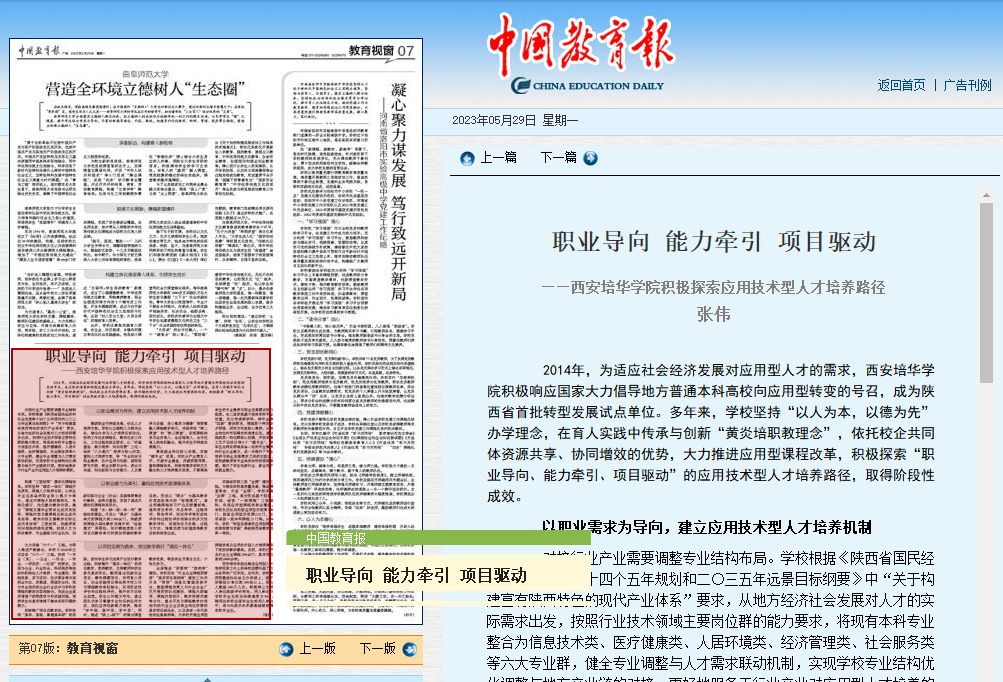 2014年,为适应社会经济发展对应用型人才的需求,西安培华学院积极响应国家大力倡导地方普通本科高校向应用型转变的号召,成为陕西省首批转型发展试点单位。多年来,学校坚持“以人为本,以德为先”办学理念,在育人实践中传承与创新“黄炎培职教理念”,依托校企共同体资源共享、协同增效的优势,大力推进应用型课程改革,积极探索“职业导向、能力牵引、项目驱动”的应用技术型人才培养路径,取得阶段性成效。