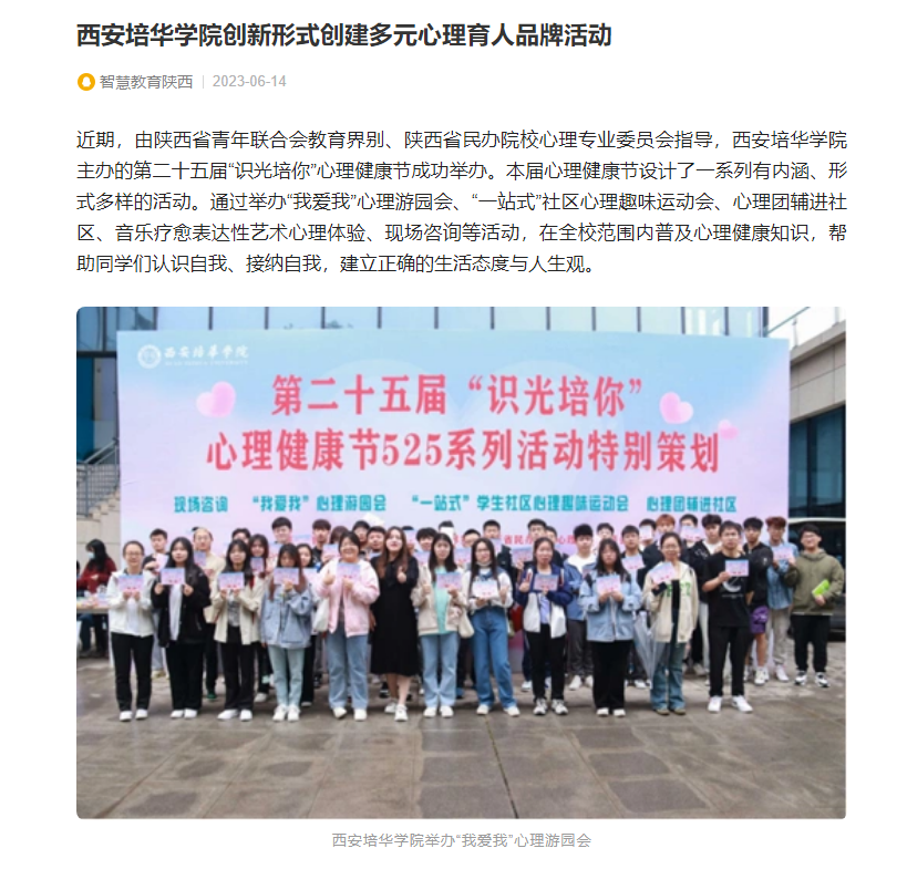 该校学生潜能发展中心主任韩赟表示,心理健康教育作为落实立德树人根本任务的重要抓手,西安培华学院坚持将育心和育人相结合,以生涯规划为引领,促进学生心理健康,助力大学生身心健康发展为目标,进一步提升大学生心理健康工作的针对性和有效性,持续多样化、立体化、个性化探索心理育人新模式和新方法。