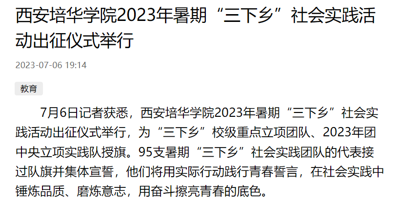 7月6日记者获悉,西安培华学院2023年暑期“三下乡”社会实践活动出征仪式举行,为“三下乡”校级重点立项团队、2023年团中央立项实践队授旗。95支暑期“三下乡”社会实践团队的代表接过队旗并集体宣誓,他们将用实际行动践行青春誓言,在社会实践中锤炼品质、磨炼意志,用奋斗擦亮青春的底色。