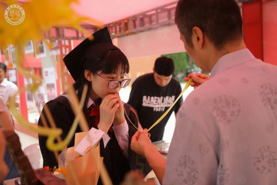 2023年,正值学校建校95周年,场馆外,学校特别搭建了意义深远的“95周年历史长河”景观墙,设置了励志古诗词的道旗与路标,与“平步青云”“掷地有声”“功不‘糖’捐”“事事如意”的毕业游戏互动区遥相呼应,毕业生们手持“致青春”“前程似锦”“乘风破浪”“未来可期”等主题元素的手牌纷纷合影留念。