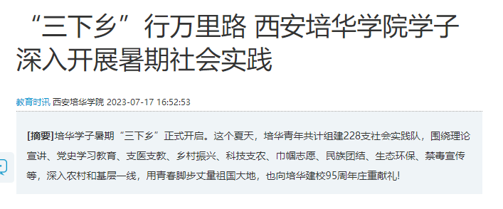 时代各有不同,青春一脉相承。暑期“三下乡”实践活动中,培华学子在亲身经历中,坚定理想信念,了解国情民情社情、练就过硬本领,把青春奉献在党和国家最需要的地方,在社会实践的舞台上谱写更新、更美的篇章!