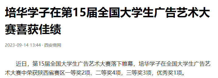 近日,第15届全国大学生广告艺术大赛落下帷幕,培华学子在全国大学生广告艺术大赛中荣获陕西省赛区一等奖2项、二等奖4项,三等奖3项,优秀奖1项。