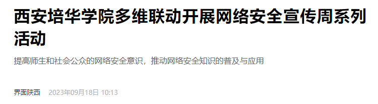 2023年国家网络安全宣传周将于9月11日至17日在全国范围内统一开展,西安培华学院第一时间下发了相应的活动实施方案,校内各个单位围绕中心工作创新性地开展网络安全宣传工作,形成网络安全人人关心、人人参与的良好氛围。