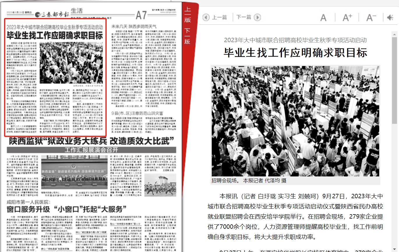 9月27日,2023年大中城市联合招聘高校毕业生秋季专项活动启动仪式暨陕西省民办高校就业联盟招聘会在西安培华学院举行。在招聘会现场,279家企业提供了7000余个岗位,人力资源管理师提醒高校毕业生,找工作前明确自身求职目标,将大大提升求职成功率。