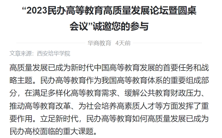 为推动民办高等教育高质量发展,陕西省高等教育学会、陕西省民办教育协会、西安培华学院将于10月22日联合举办“2023民办高等教育高质量发展论坛暨圆桌会议”(以下简称“论坛”)。在培华建校95周年之际,通过本次论坛,旨在搭建一个学术交流平台,汇聚高等教育专家学者、民办高校负责人、行业企业专家等,分享办学经验、探讨发展路径,形成提升民办高等教育高质量发展的策略。我们诚挚邀请民办高校董事长(理事长)、校长,高等教育专家学者出席此次盛会。您的出席将为本次论坛增添更多的精彩与深度,为与会嘉宾带来全新的启示和思考。