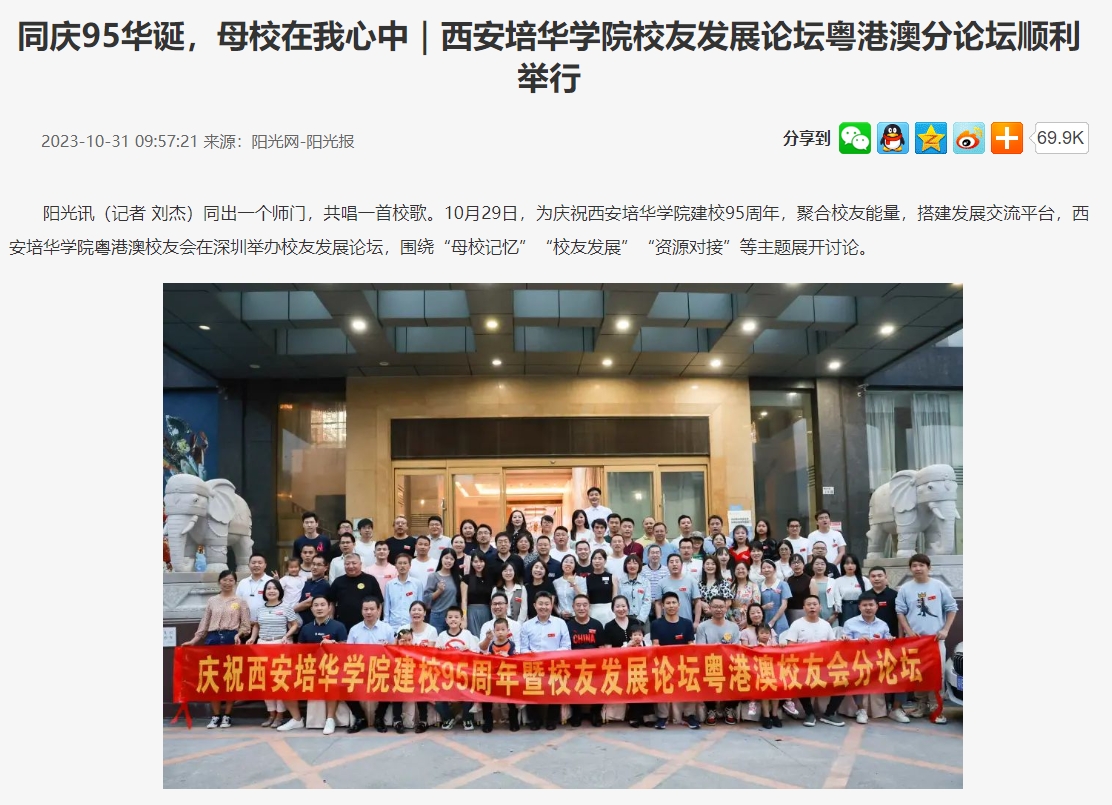 阳光讯(记者 刘杰)同出一个师门,共唱一首校歌。10月29日,为庆祝西安培华学院建校95周年,聚合校友能量,搭建发展交流平台,西安培华学院粤港澳校友会在深圳举办校友发展论坛,围绕“母校记忆”“校友发展”“资源对接”等主题展开讨论。