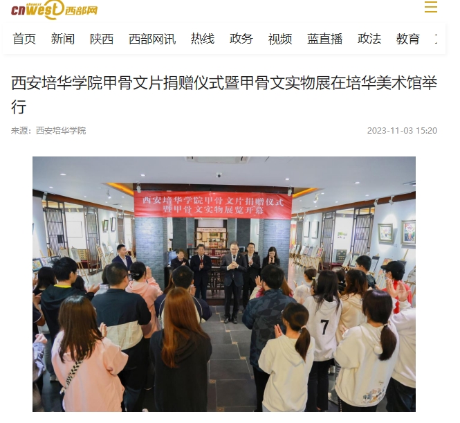 10月27日,西安培华学院甲骨文片捐赠仪式暨甲骨文实物展在培华美术馆举行,民间收藏者、陕西省安康市汉阴县科协原秘书长王忠义携夫人陈昭茹,西安培华学院理事长姜波,校长助理秦海锋,人文与国际教育学院常务副院长梁蕊及师生代表参加了仪式。活动由党委宣传部部长、校友服务与发展中心主任柳雨主持。