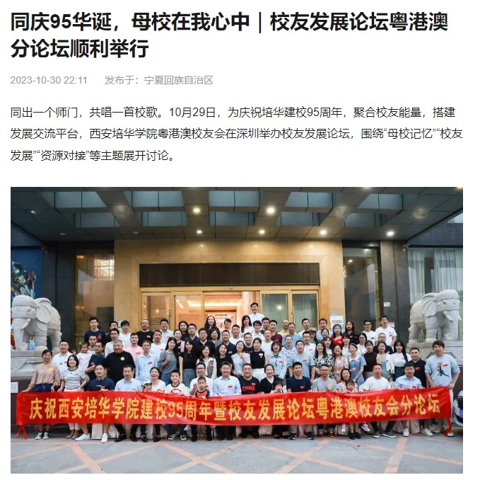 同出一个师门,共唱一首校歌。10月29日,为庆祝培华建校95周年,聚合校友能量,搭建发展交流平台,西安培华学院粤港澳校友会在深圳举办校友发展论坛,围绕“母校记忆”“校友发展”“资源对接”等主题展开讨论。