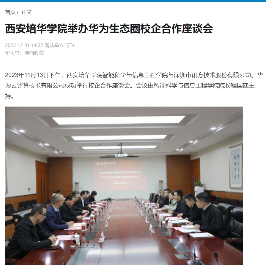 2023年11月13日下午,西安培华学院智能科学与信息工程学院与深圳市讯方技术股份有限公司、华为云计算技术有限公司成功举行校企合作座谈会。会议由智能科学与信息工程学院院长程国建主持。