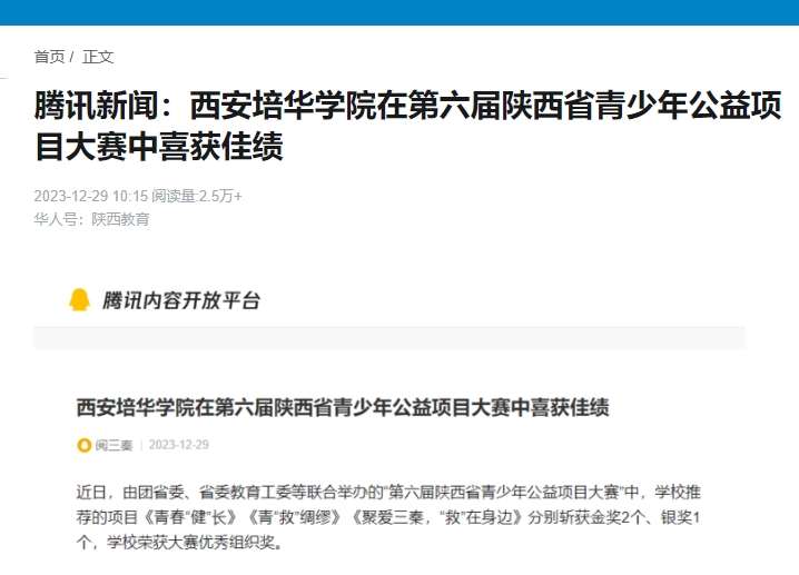 近日,由团省委、省委教育工委等联合举办的“第六届陕西省青少年公益项目大赛”中,西安培华学院推荐的项目《青春“健”长》《青“救”绸缪》《聚爱三秦,“救”在身边》分别斩获金奖2个、银奖1个,西安培华学院荣获大赛优秀组织奖。