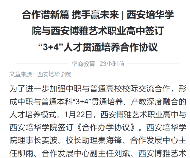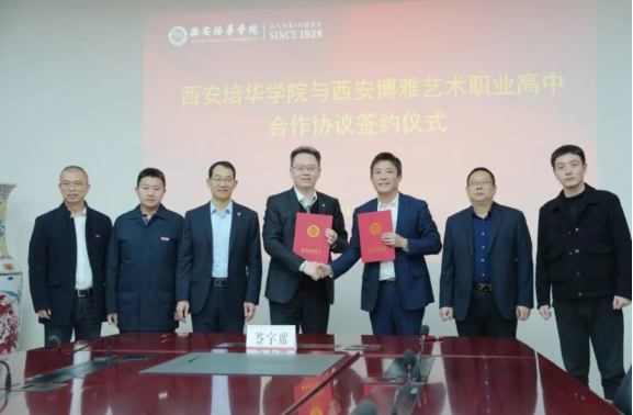 为了进一步加强中职与普通高校校际交流合作,形成中职与普通本科“3+4”贯通培养、产教深度融合的人才培养模式,1月22日,西安博雅艺术职业高中与西安培华学院签订《合作办学协议》。西安培华学院理事长姜波、校长助理秦海锋、合作发展中心主任柳雨、合作发展中心副主任刘斌、西安博雅艺术职业高中理事长白帆、党支部书记 校长张胜强、副校长岳飞出席签约仪式。
