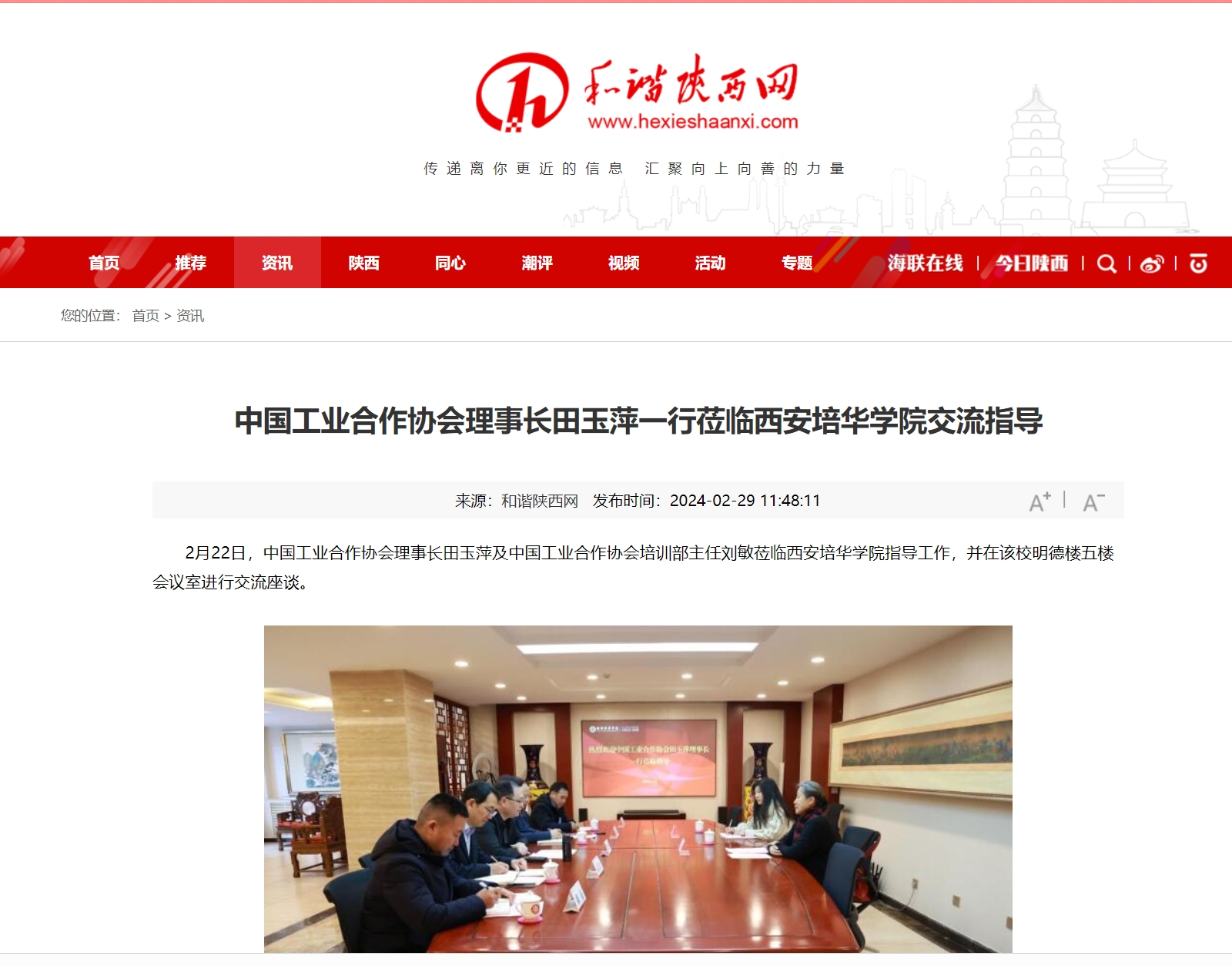 2月22日,中国工业合作协会理事长田玉萍及中国工业合作协会培训部主任刘敏莅临西安培华学院指导工作,并在该校明德楼五楼会议室进行交流座谈。