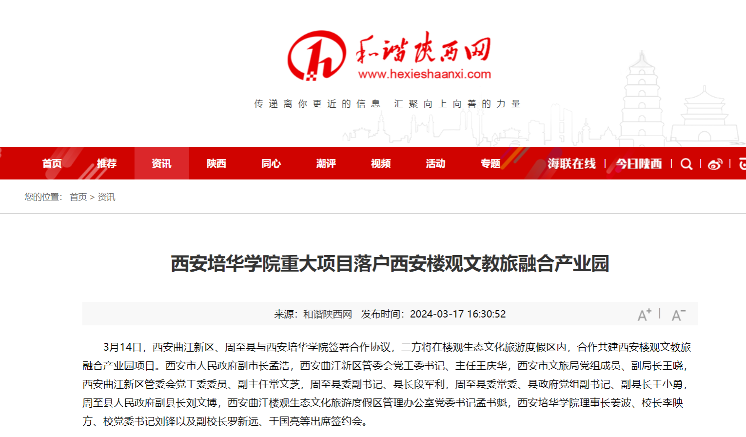 3月14日,曲江新区、周至县与西安培华学院签署合作协议,三方将在楼观生态文化旅游度假区内,合作共建西安楼观文教旅融合产业园项目。西安市人民政府副市长孟浩,西安曲江新区管委会党工委书记、主任王庆华,西安市文旅局党组成员、副局长王晓,西安曲江新区管委会党工委委员、副主任常文芝,周至县委副书记、县长段军利,周至县委常委、县政府党组副书记、副县长王小勇,周至县人民政府副县长刘文博,西安曲江楼观生态文化旅游度假区管理办公室党委书记孟书魁,学校理事长姜波,校长李映方、党委书记刘锋、副校长罗新远、于国亮等出席签约会。