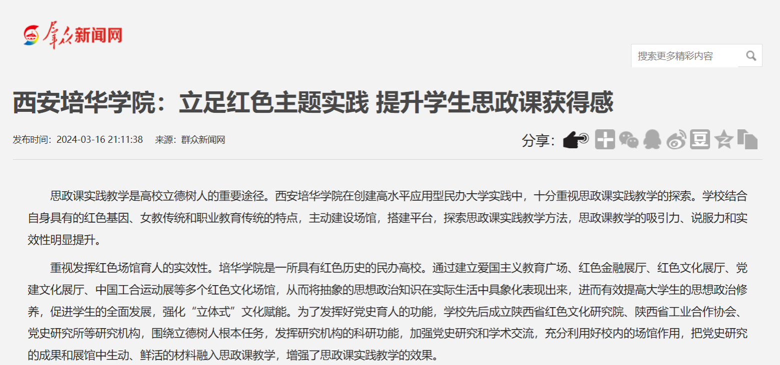 重视发挥红色场馆育人的实效性。培华学院是一所具有红色历史的民办高校。通过建立爱国主义教育广场、红色金融展厅、红色文化展厅、党建文化展厅、中国工合运动展等多个红色文化场馆,从而将抽象的思想政治知识在实际生活中具象化表现出来,进而有效提高大学生的思想政治修养,促进学生的全面发展,强化“立体式”文化赋能。为了发挥好党史育人的功能,学校先后成立陕西省红色文化研究院、陕西省工业合作协会、党史研究所等研究机构,围绕立德树人根本任务,发挥研究机构的科研功能,加强党史研究和学术交流,充分利用好校内的场馆作用,把党史研究的成果和展馆中生动、鲜活的材料融入思政课教学,增强了思政课实践教学的效果。