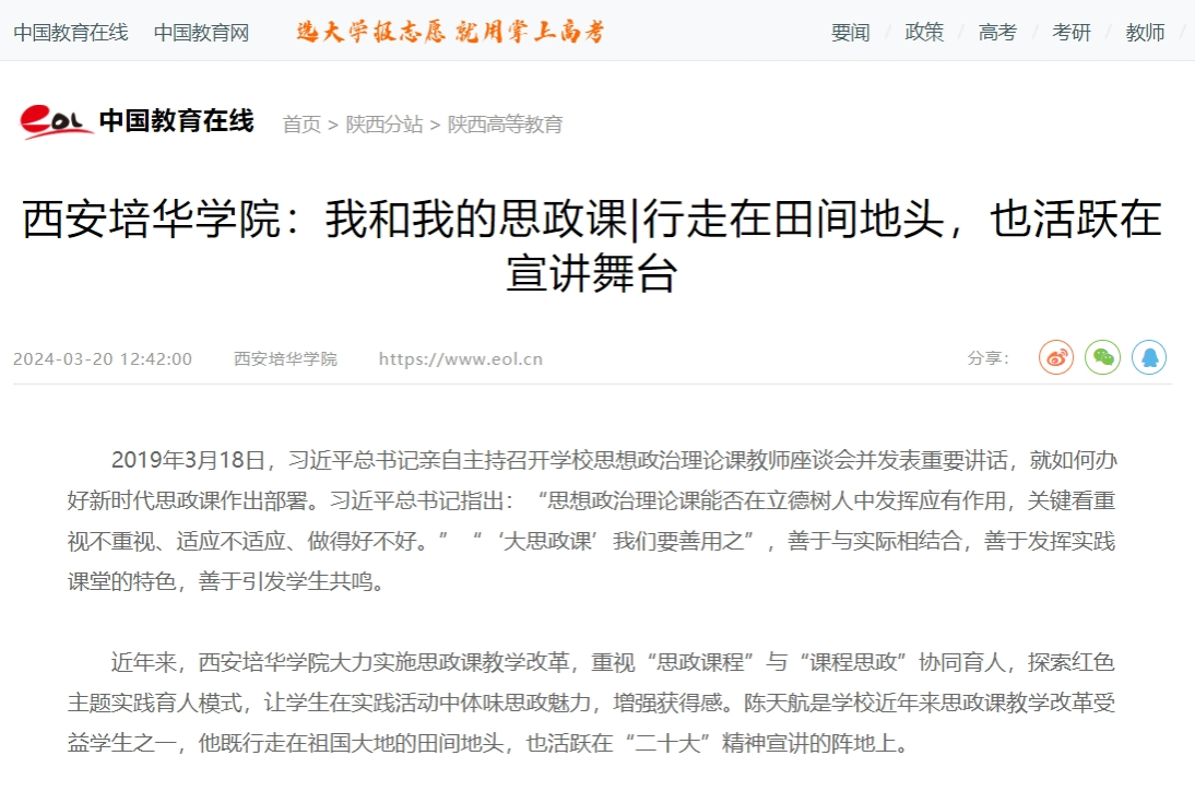 近年来,西安培华学院大力实施思政课教学改革,重视“思政课程”与“课程思政”协同育人,探索红色主题实践育人模式,让学生在实践活动中体味思政魅力,增强获得感。陈天航是学校近年来思政课教学改革受益学生之一,他既行走在祖国大地的田间地头,也活跃在“二十大”精神宣讲的阵地上。