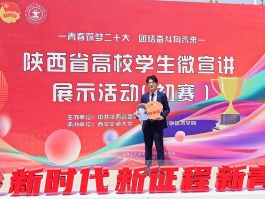 凭着日常的积累与探索,他掌握了大量的演讲技巧,通过院级、校级、省级层层选拔,最终入选陕西省大学生二十大精神宣讲团,走上西安交通大学的宣讲舞台,为全省青年学子传播二十大声音。