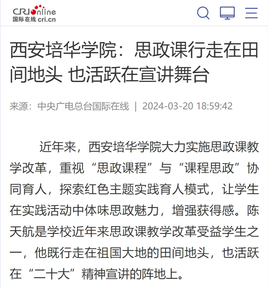 近年来,西安培华学院大力实施思政课教学改革,重视“思政课程”与“课程思政”协同育人,探索红色主题实践育人模式,让学生在实践活动中体味思政魅力,增强获得感。陈天航是学校近年来思政课教学改革受益学生之一,他既行走在祖国大地的田间地头,也活跃在“二十大”精神宣讲的阵地上。