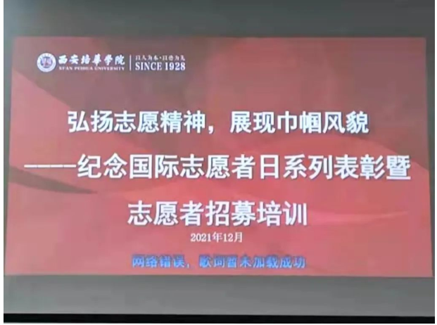 为进一步落实中央文明委关于新时代文明实践活动的重要指示,在第36个“国际志愿者日”来临之际,西安培华学院女子学院为弘扬“奉献、友爱、互助、进步”的志愿精神,激励志愿者为社会和谐进步做出更大的贡献,于2021年12月2日下午在3503教室举行纪念活动暨志愿服务证书颁发仪式,并进行寒假志愿者招募及志愿服务基础知识培训活动。