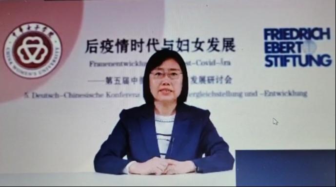 中华女子学院(全国妇联干部培训学院)院长刘利群教授出席会议并致辞。她援引国家主席习近平在联合国大会纪念北京世界妇女大会25周年高级别会议上的重要讲话,认为本次会议是落实讲话精神,“让性别平等落到实处”、“推动全球妇女事业合作”的具体体现;期望中德专家深入交流自新冠疫情传播以来中国和德国在性别平等与妇女发展方面所面临的挑战和取得的成绩、经验,思考后疫情时代背景下,未来性别平等与妇女发展事业的发展重点与方向。为进一步落实《北京行动纲领》和《北京宣言》确定的目标贡献智慧和力量。