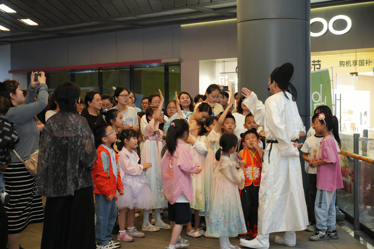 个人的兴趣、专业的赋能与学科的交叉,最终在学校搭建的平台上开花结果,完成了一次精彩的“三级跳”。在龙湖西安香醍天街的商演,成为他的闪光时刻。那天,中庭广场被人群层层环绕,回廊也站满了驻足观看的顾客,近五百名观众举起手机记录下“李白”的潇洒身影。当“仰天大笑出门去”的吟诵响起,掌声与喝彩在整个商场回荡。