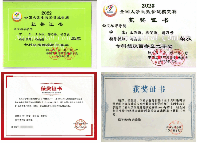 对于竞赛指导,冯晶晶成绩斐然,指导学生分别获得2023全国大学生数学建模竞赛陕西赛区二等奖、西安培华学院第二届大学生统计建模竞赛三等奖等。