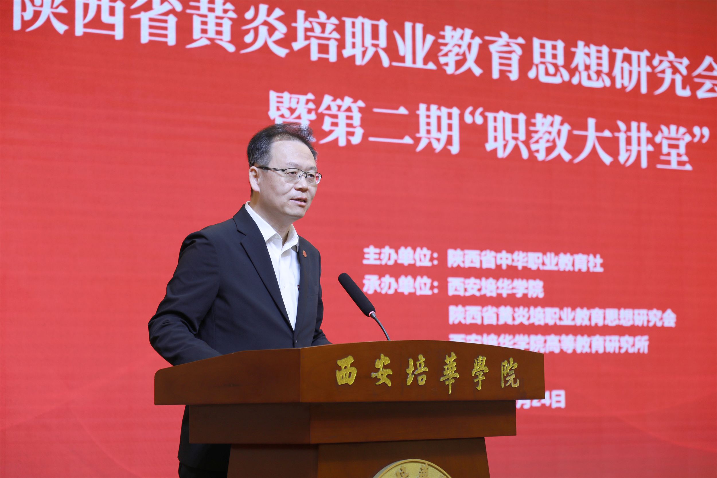 会议第二阶段“职教大讲堂”由西安培华学院副校长、学术委员会主席罗新远主持。江苏省政协委员、江苏省中华职教社副主任、江苏黄炎培职教思想研究院执行院长、南京工业职业技术大学党委原书记、研究员吴学敏作题为《黄炎培职业教育思想的传承与创新》的报告。