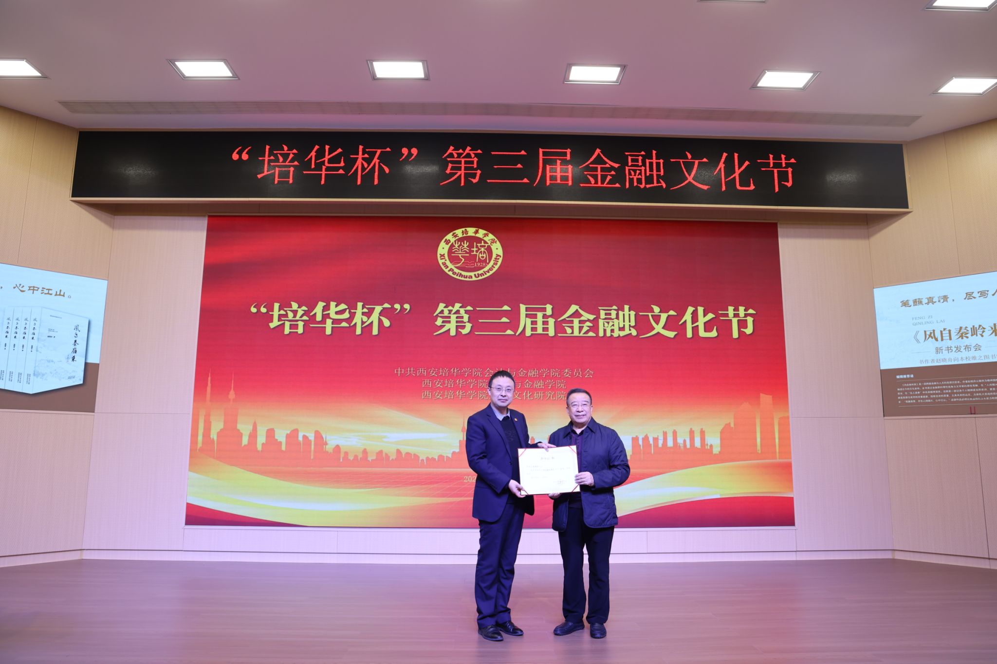 维之图书馆馆长闵波向西安培华学院金融文化研究院院长赵晓舟颁发捐赠证书