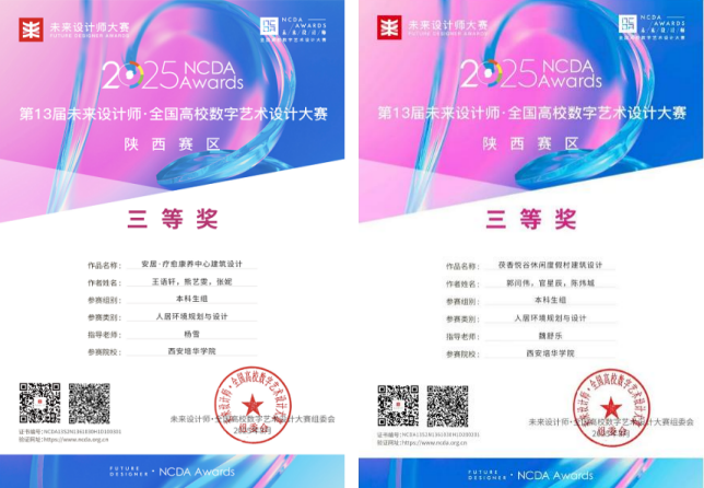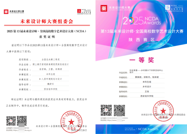 近日,第13届未来设计师・全国高校数字艺术设计大赛(NCDA)省赛圆满结束。西安培华学院建筑学专业学生表现突出,共获国家级三等奖1项、省级一等奖2项、省级三等奖5项,充分展现了培华学子扎实的专业基础与出色的创新能力。
