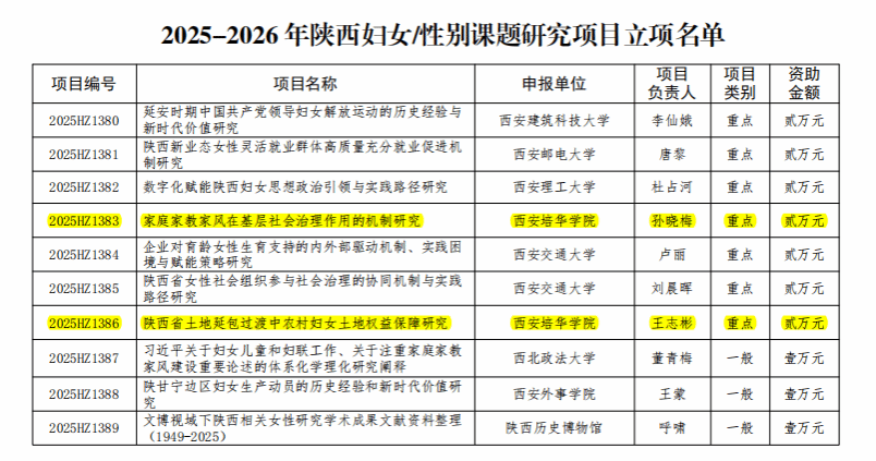 近日,陕西省哲学社会科学研究专项2025-2026年陕西妇女/性别课题研究项目立项结果公布,学校获批3项研究项目,其中重点项目2项、一般项目1项。成为在此项目当中唯一获得重点项目立项的省属民办本科高校。